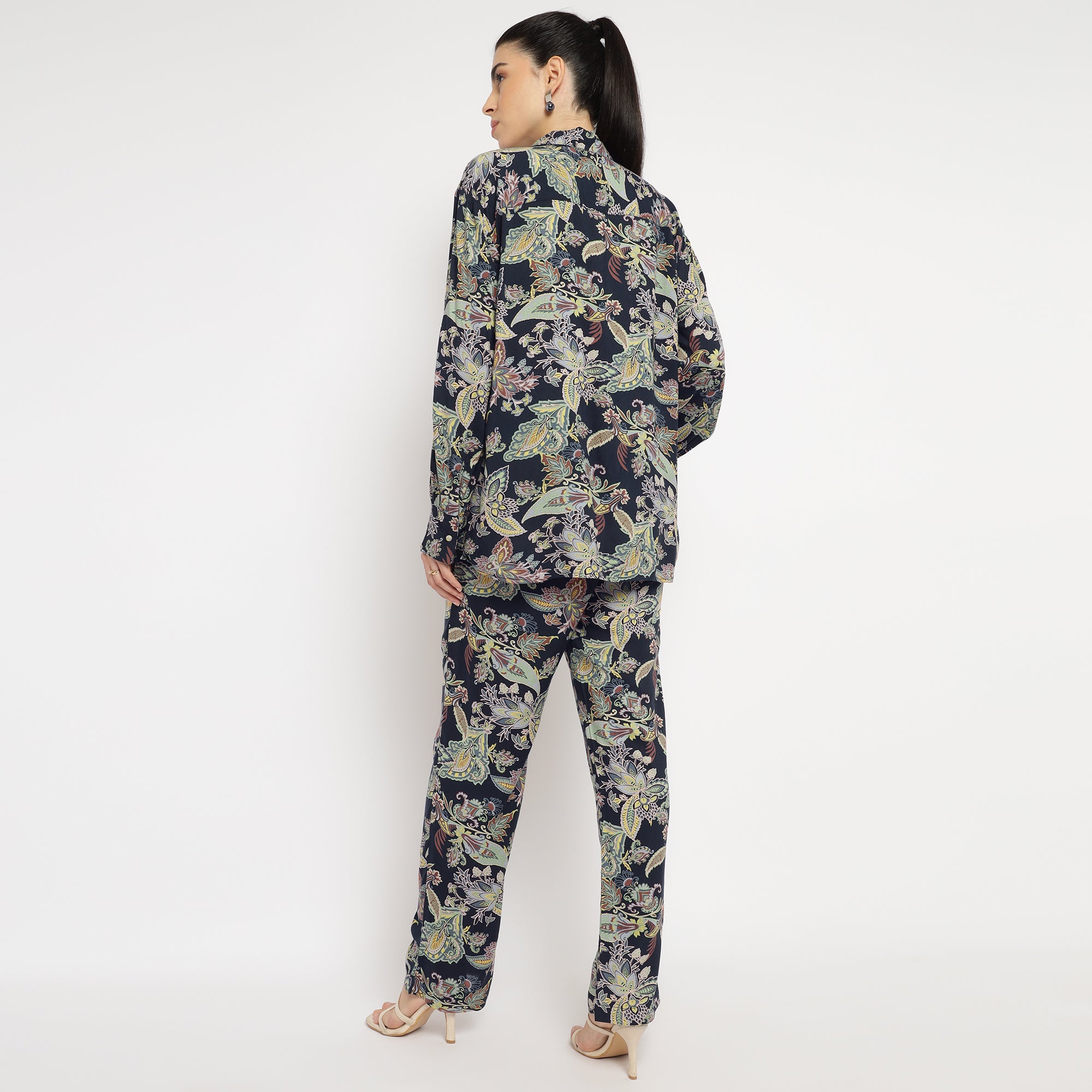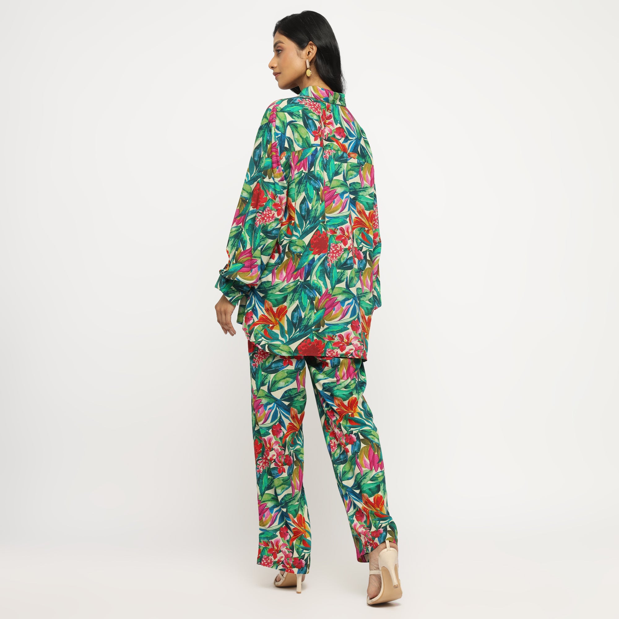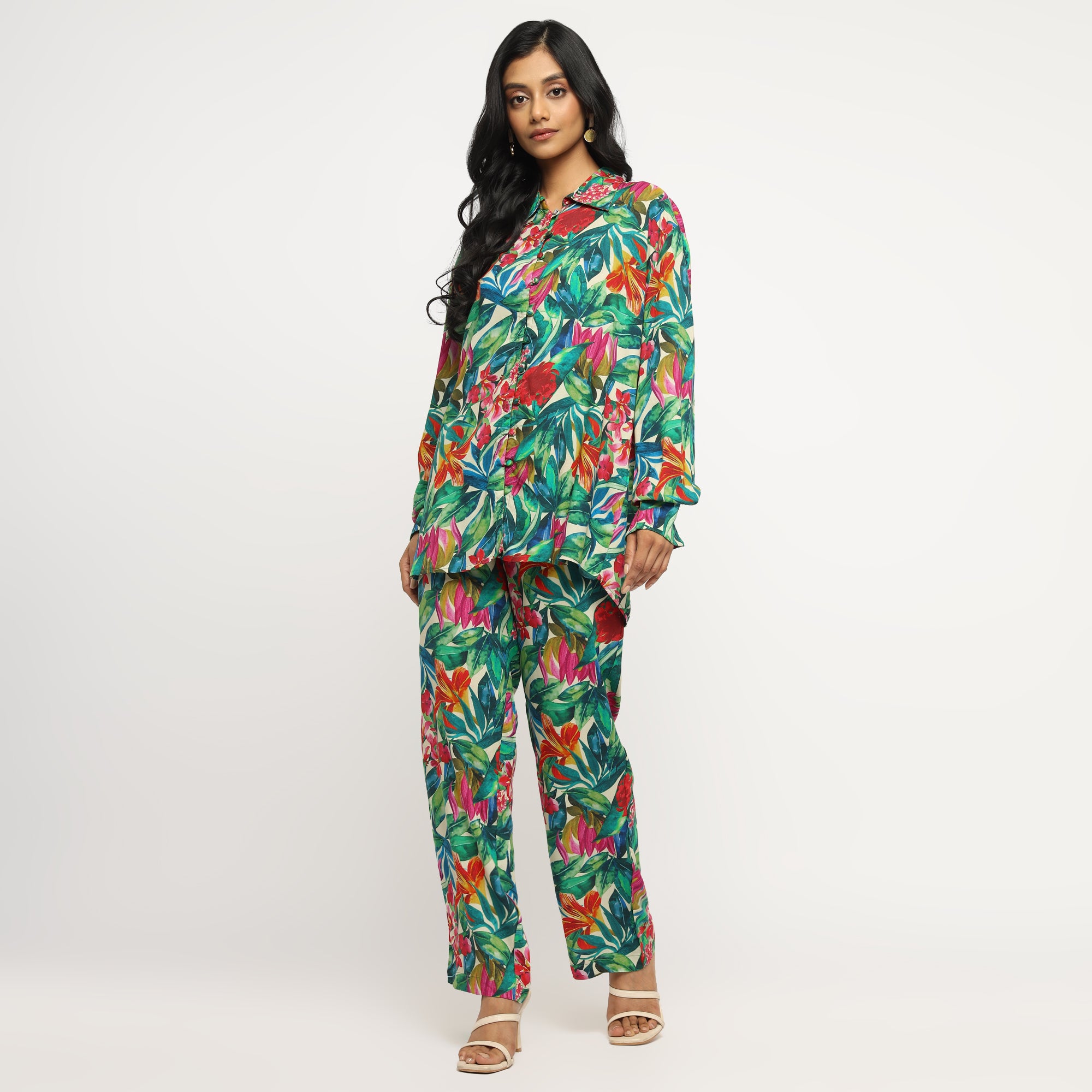 Tropical Multicolor Leaf Printed Shirt and Straight Pants Co-ord Set