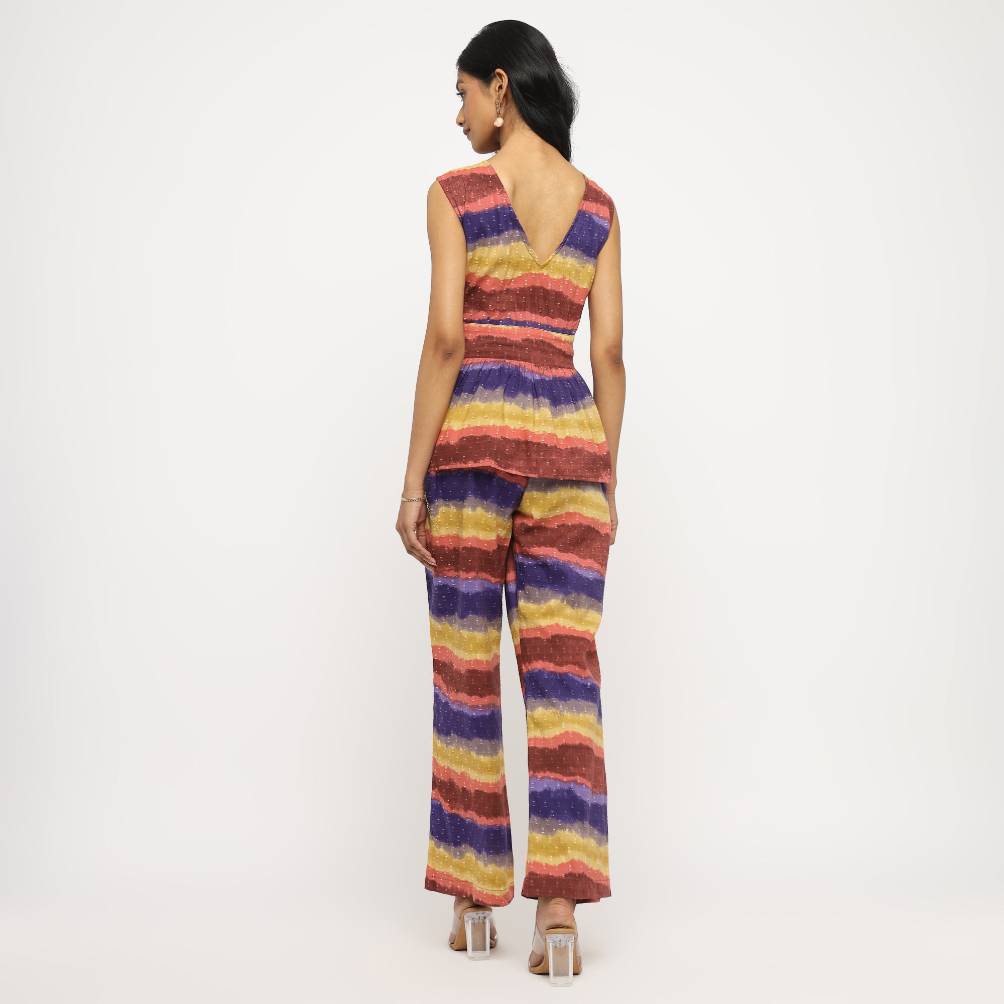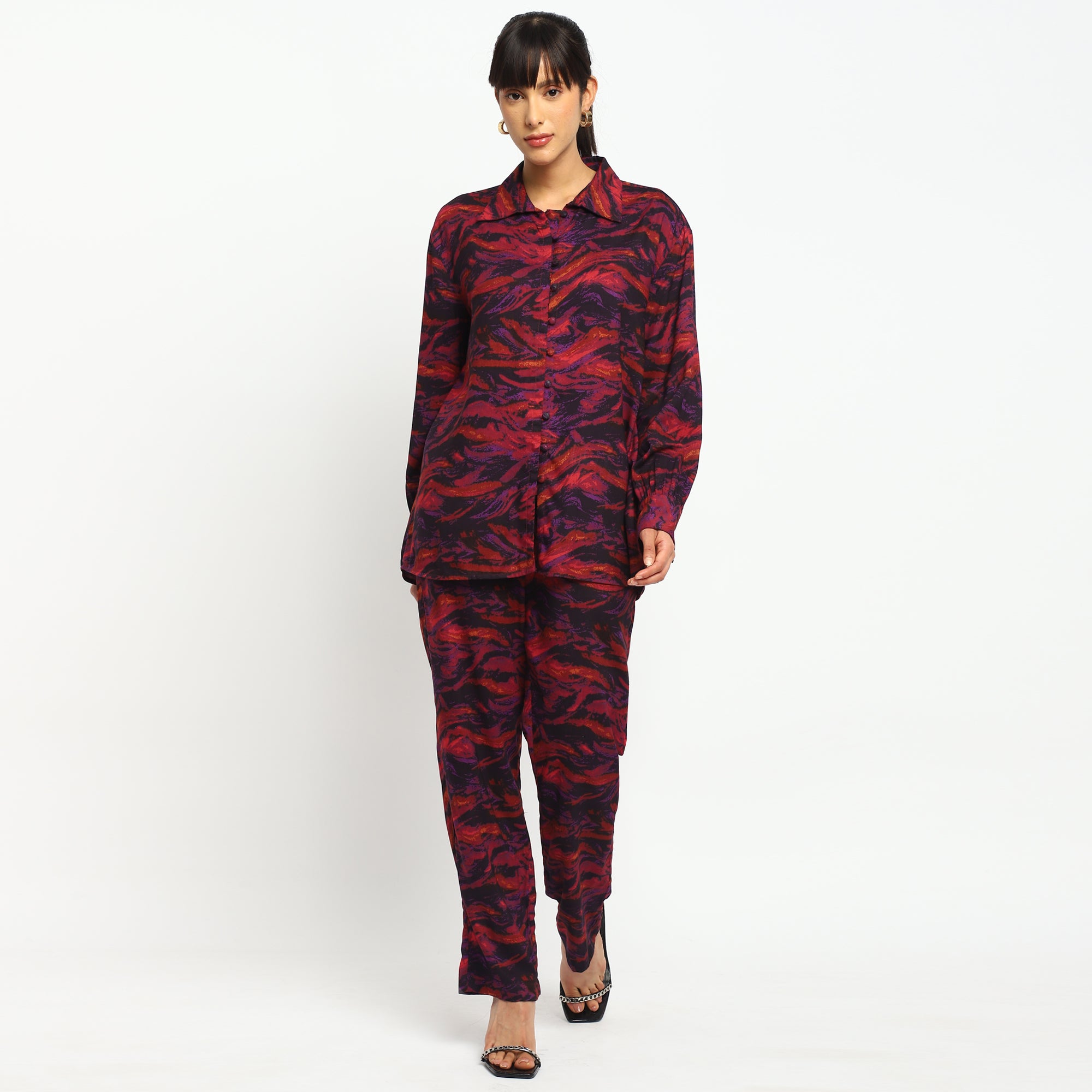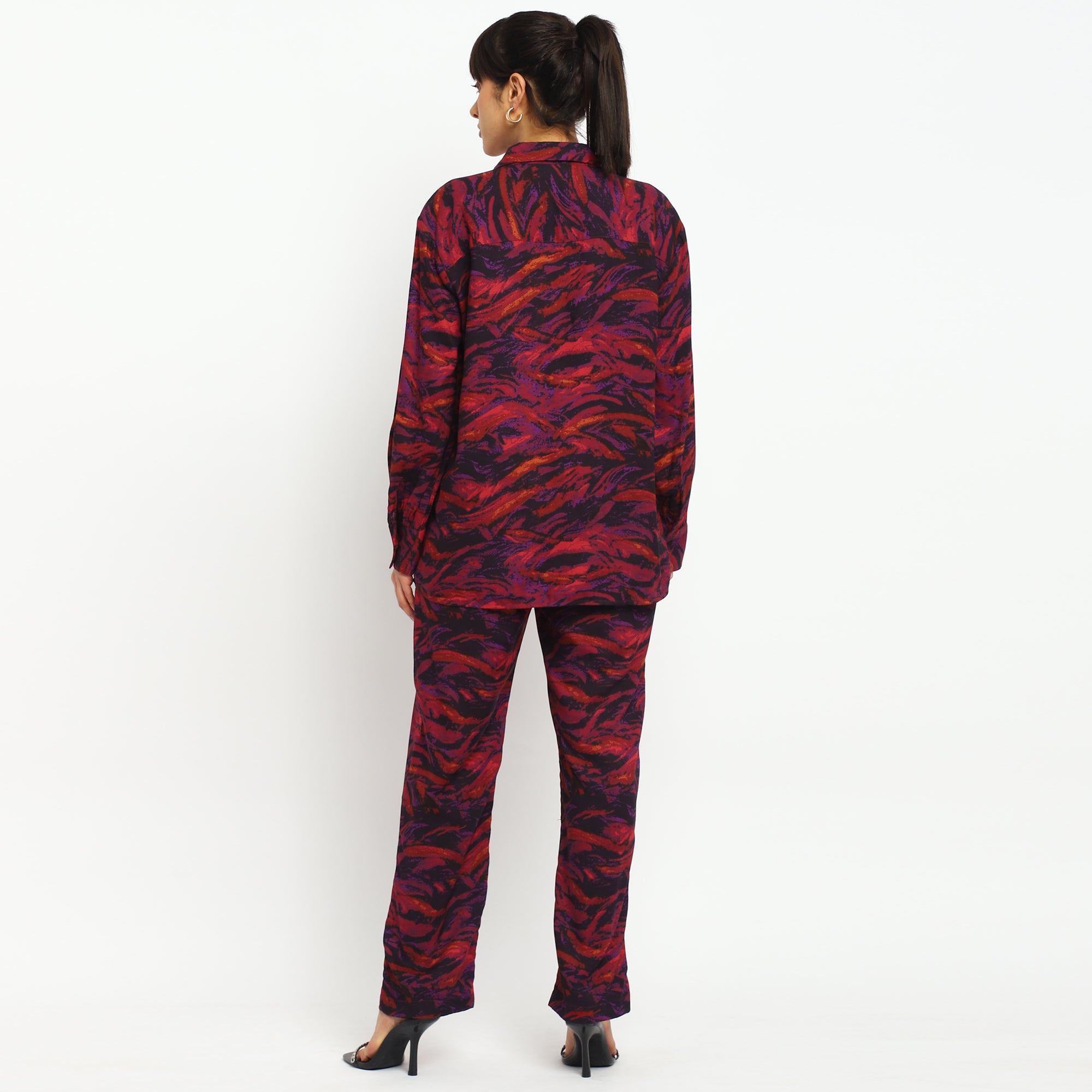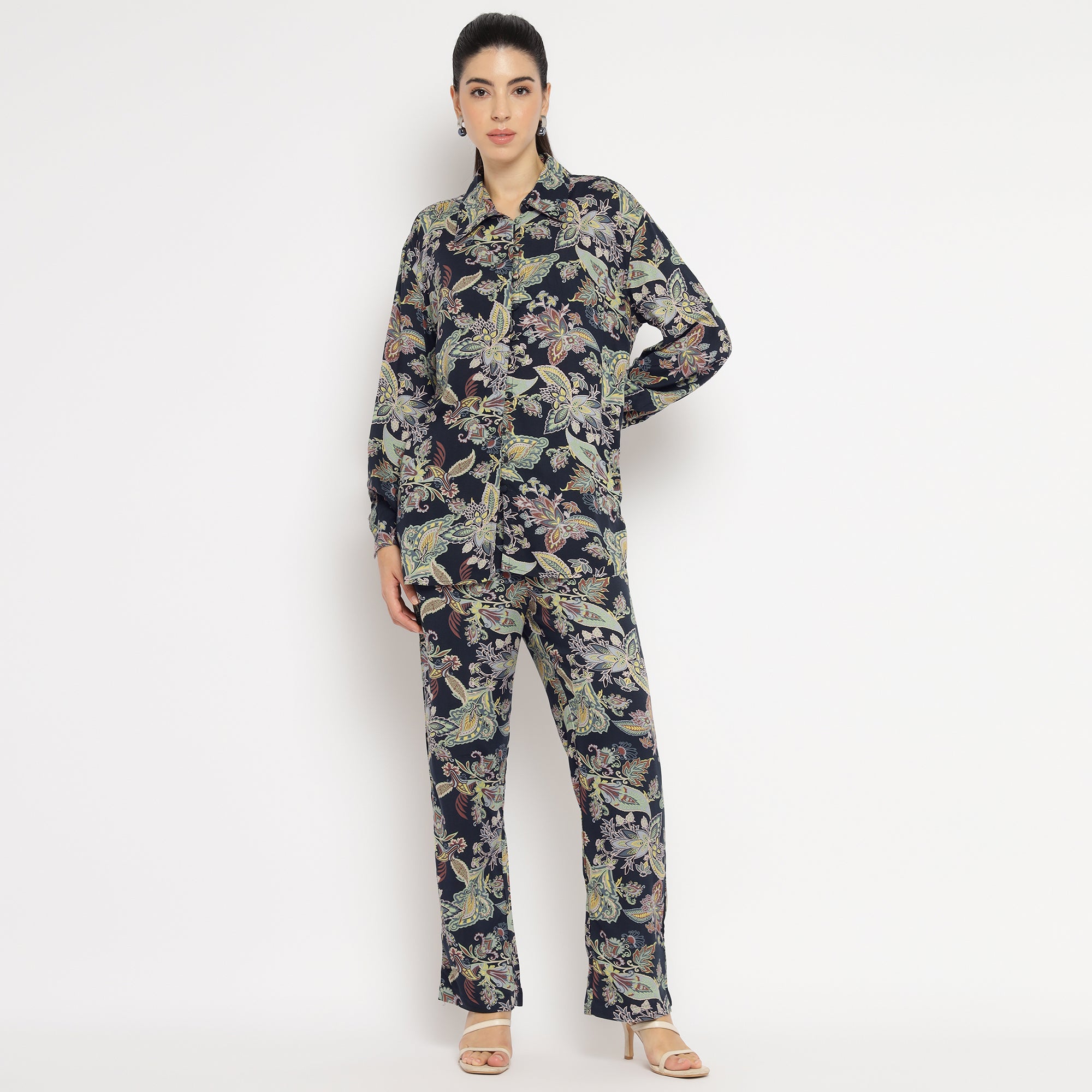 Tropical Multicolor Leaf Printed Shirt and Straight Pants Co-ord Set