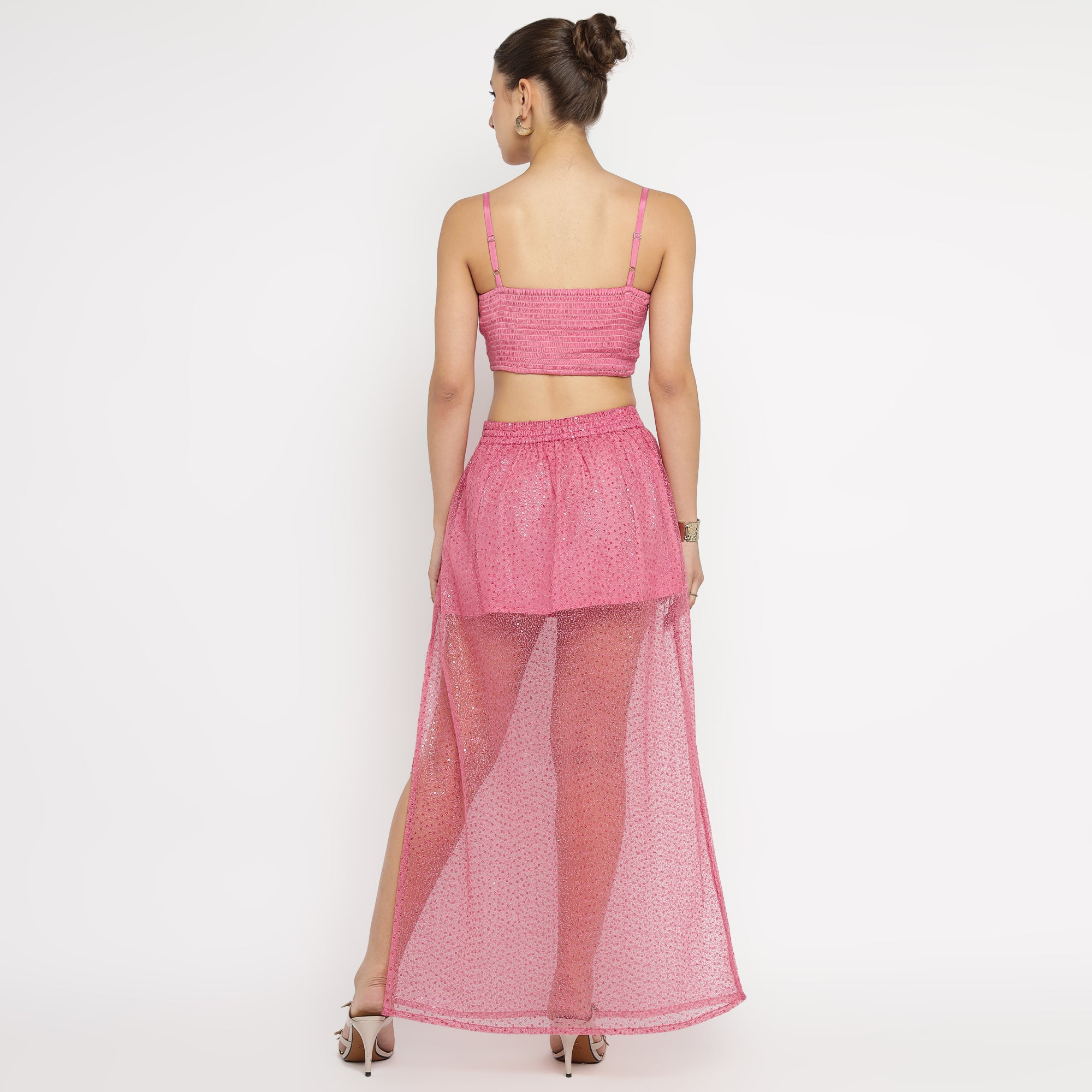 Pink Ruched Bralette & Sequin Mesh Overlay Skirt Co-ord Set