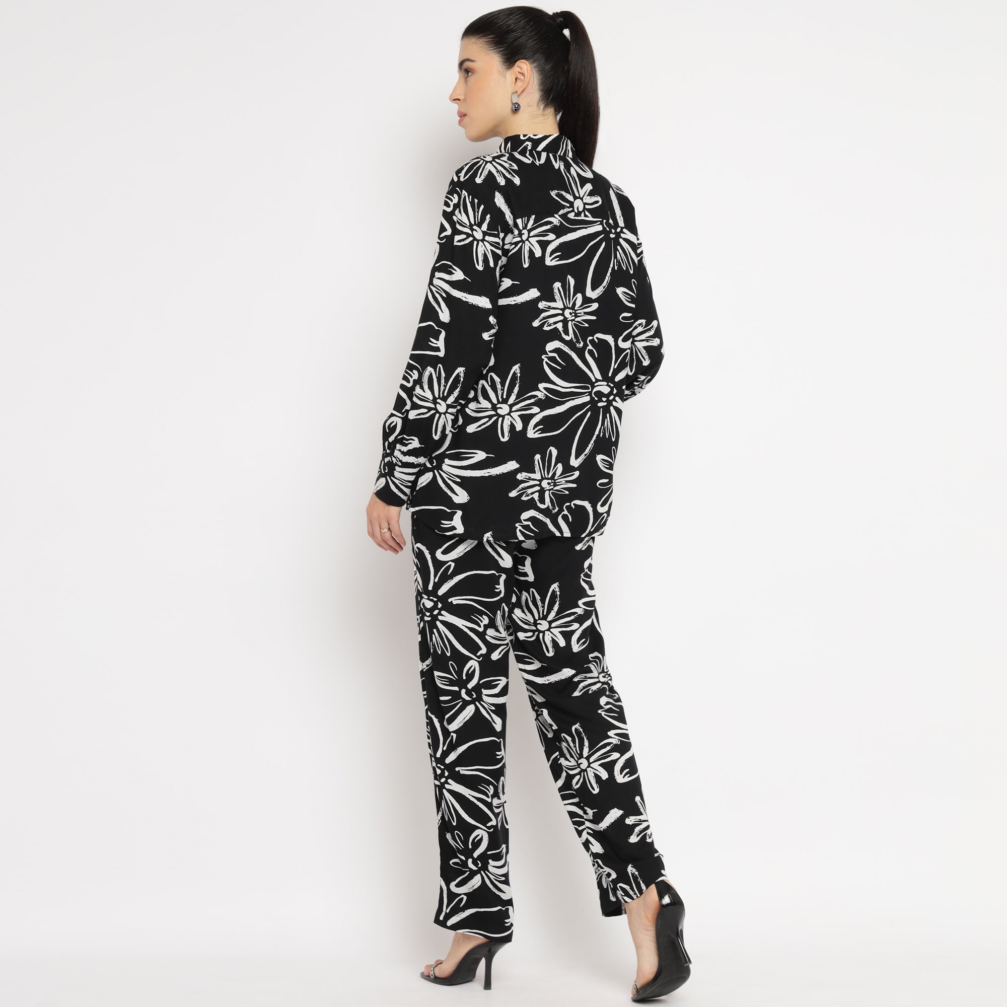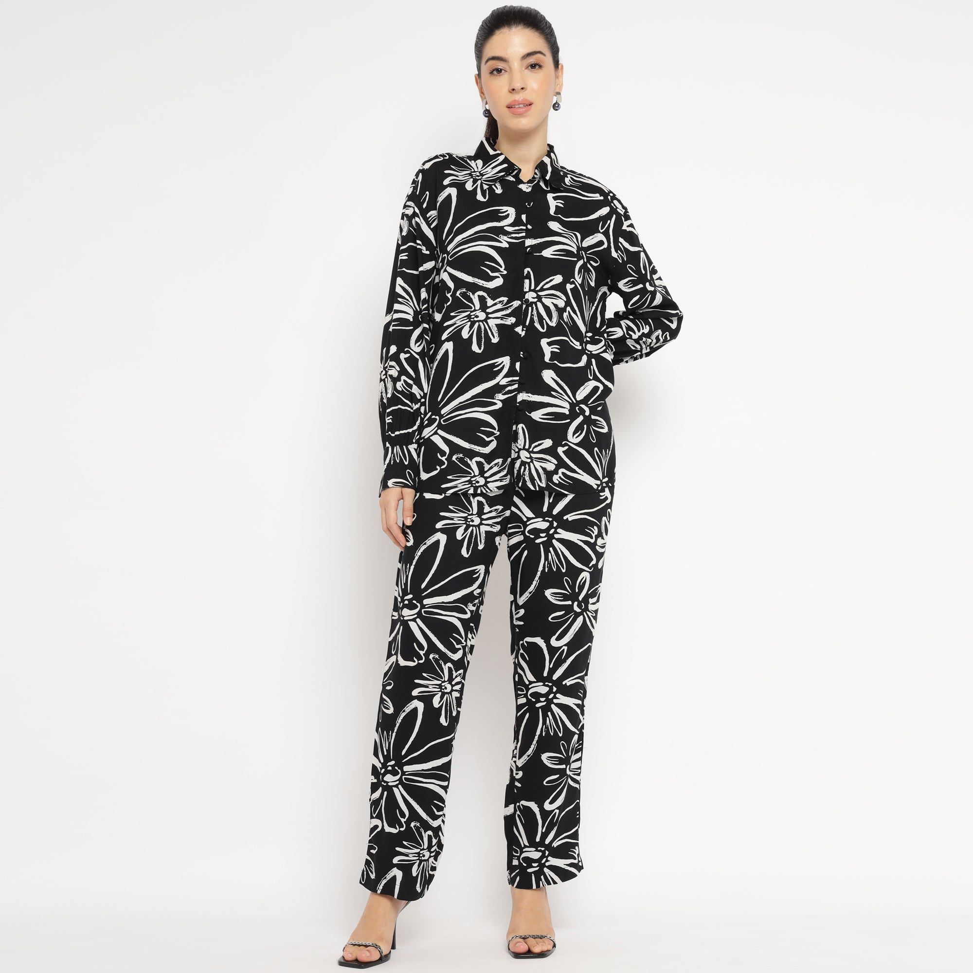 Black Oversized Floral Shirt and Straight Pants Co-ord Set