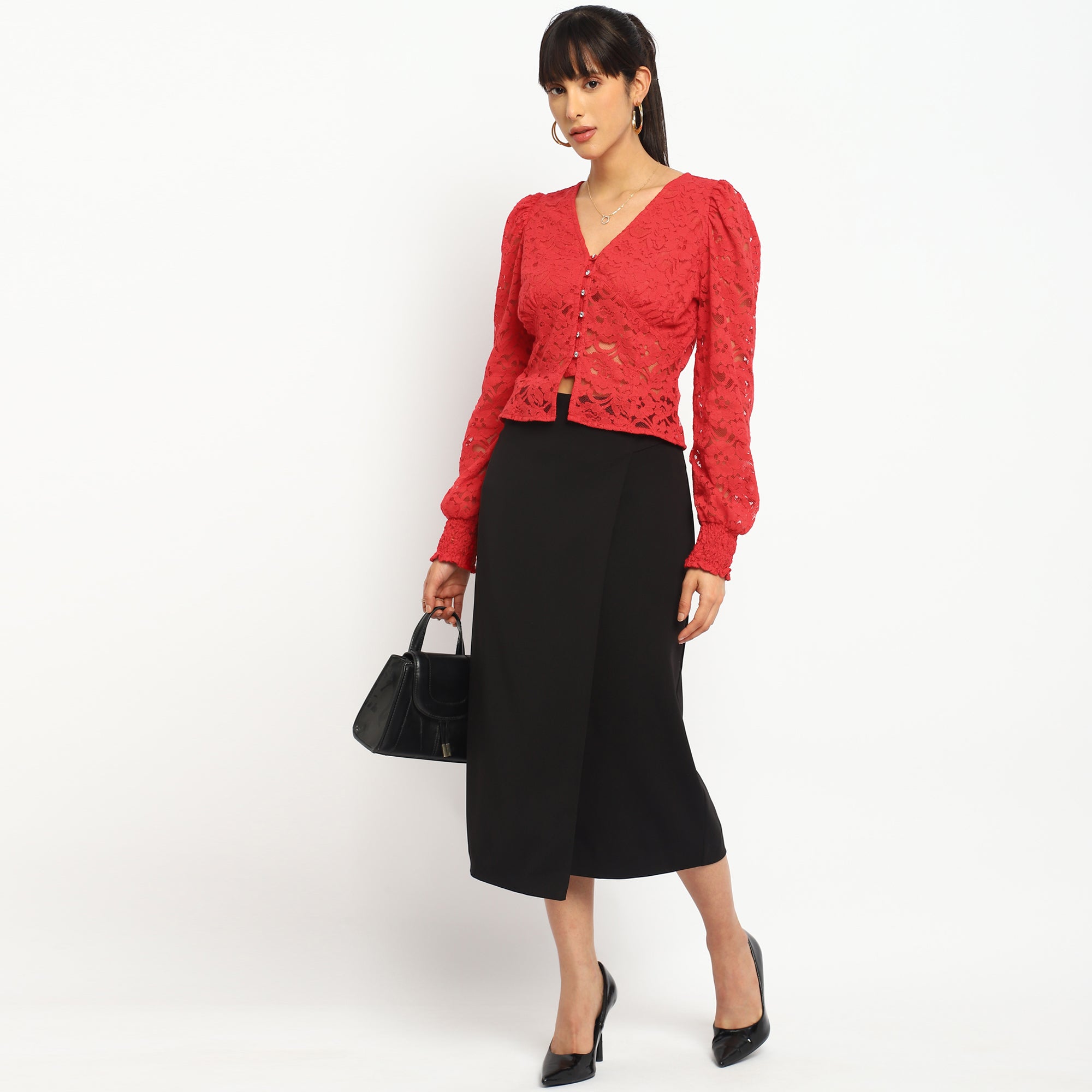 Red Lace Button-Down Blouse
