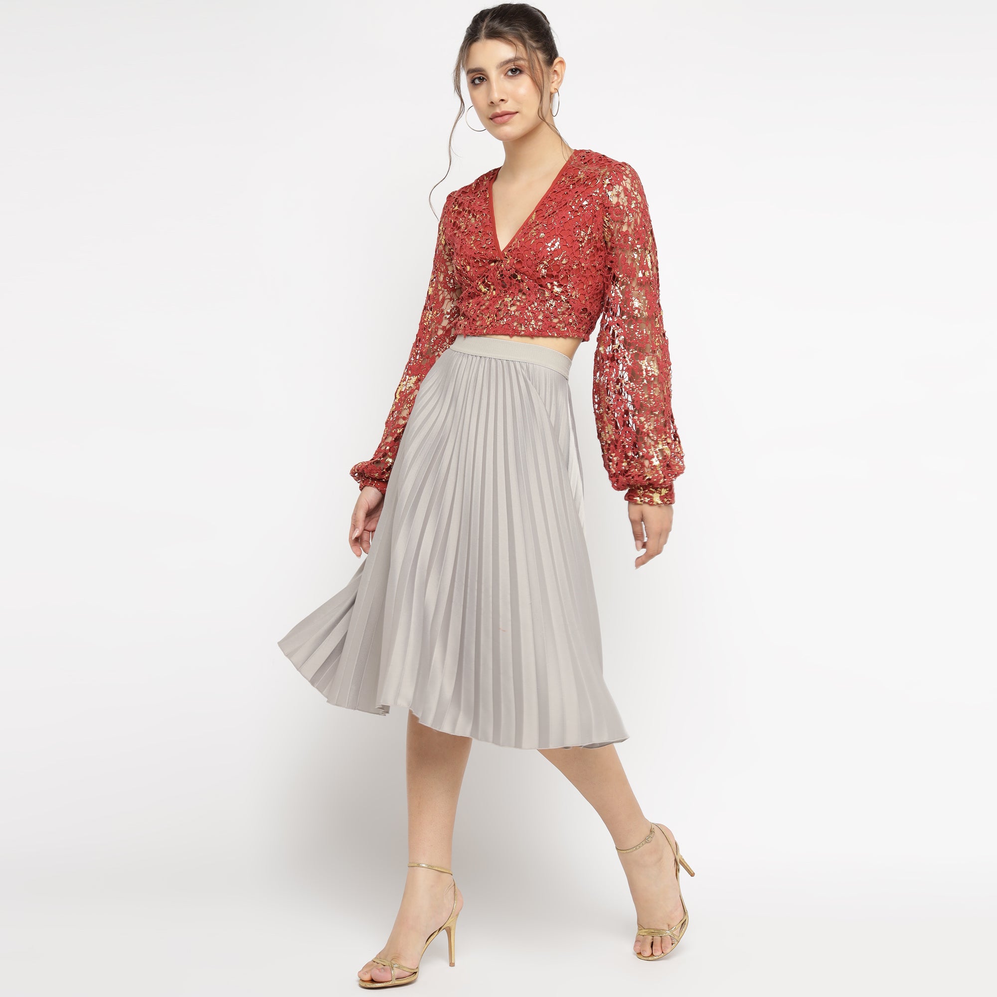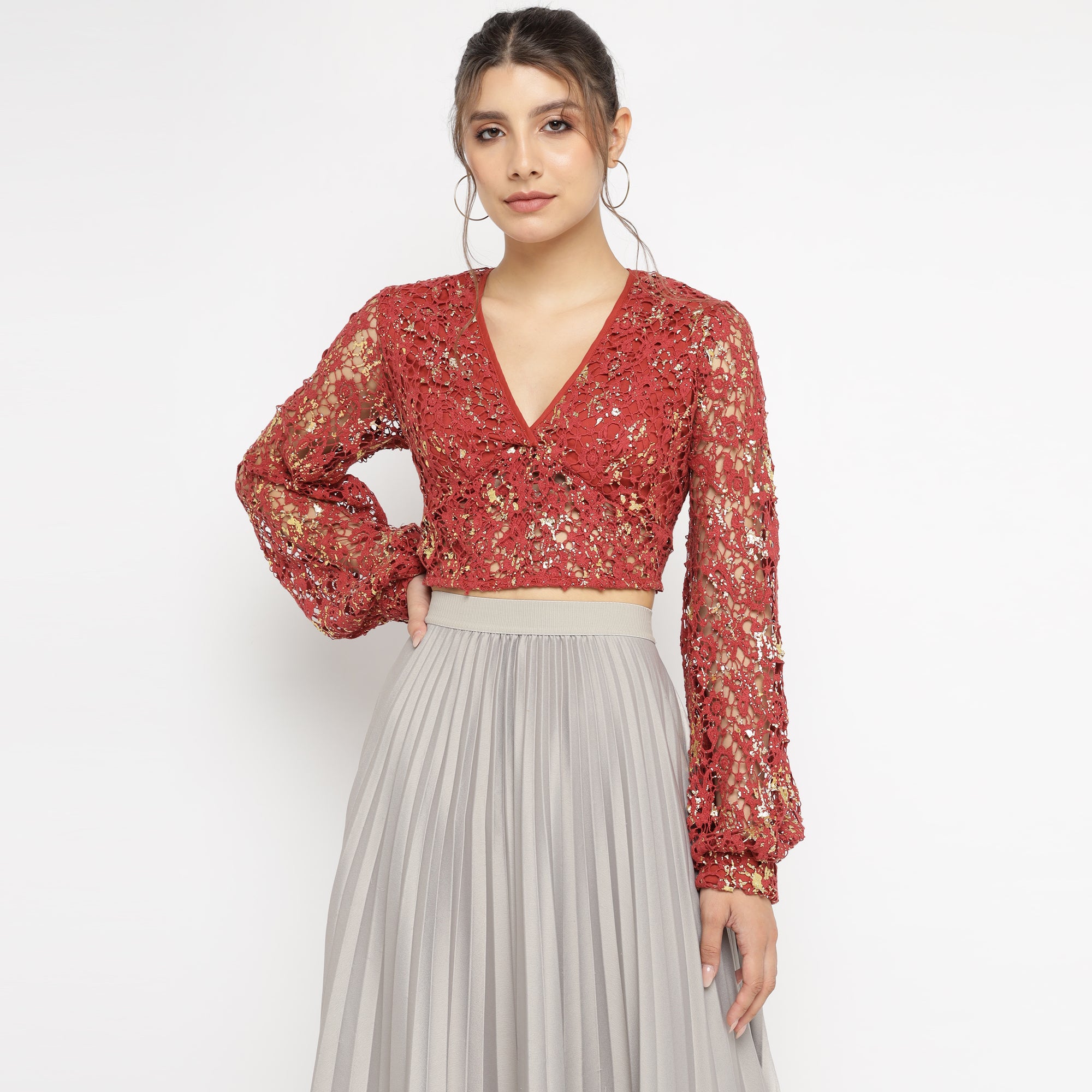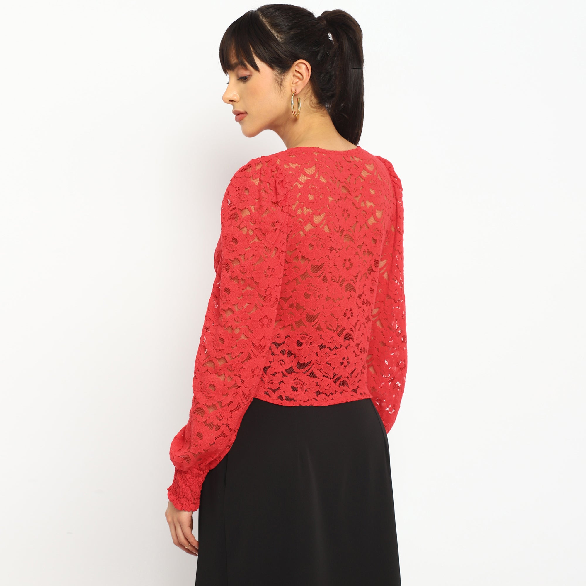 Red Foil print Lace Sheer Blouse