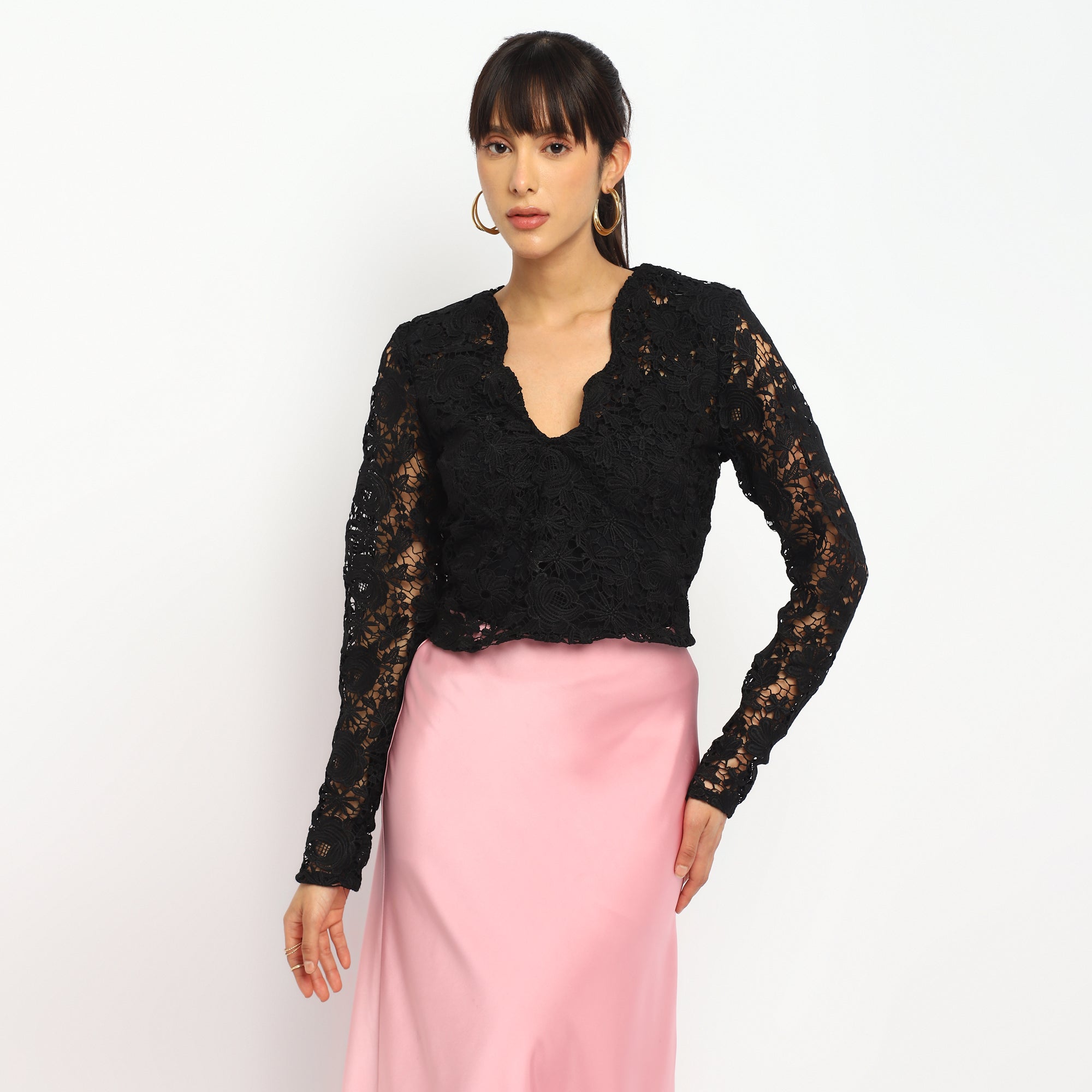 Elegant Black Lace Long-Sleeve V-neck Top