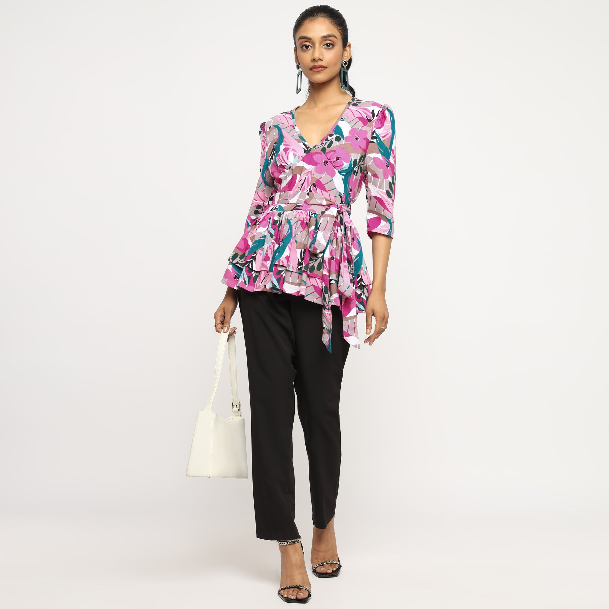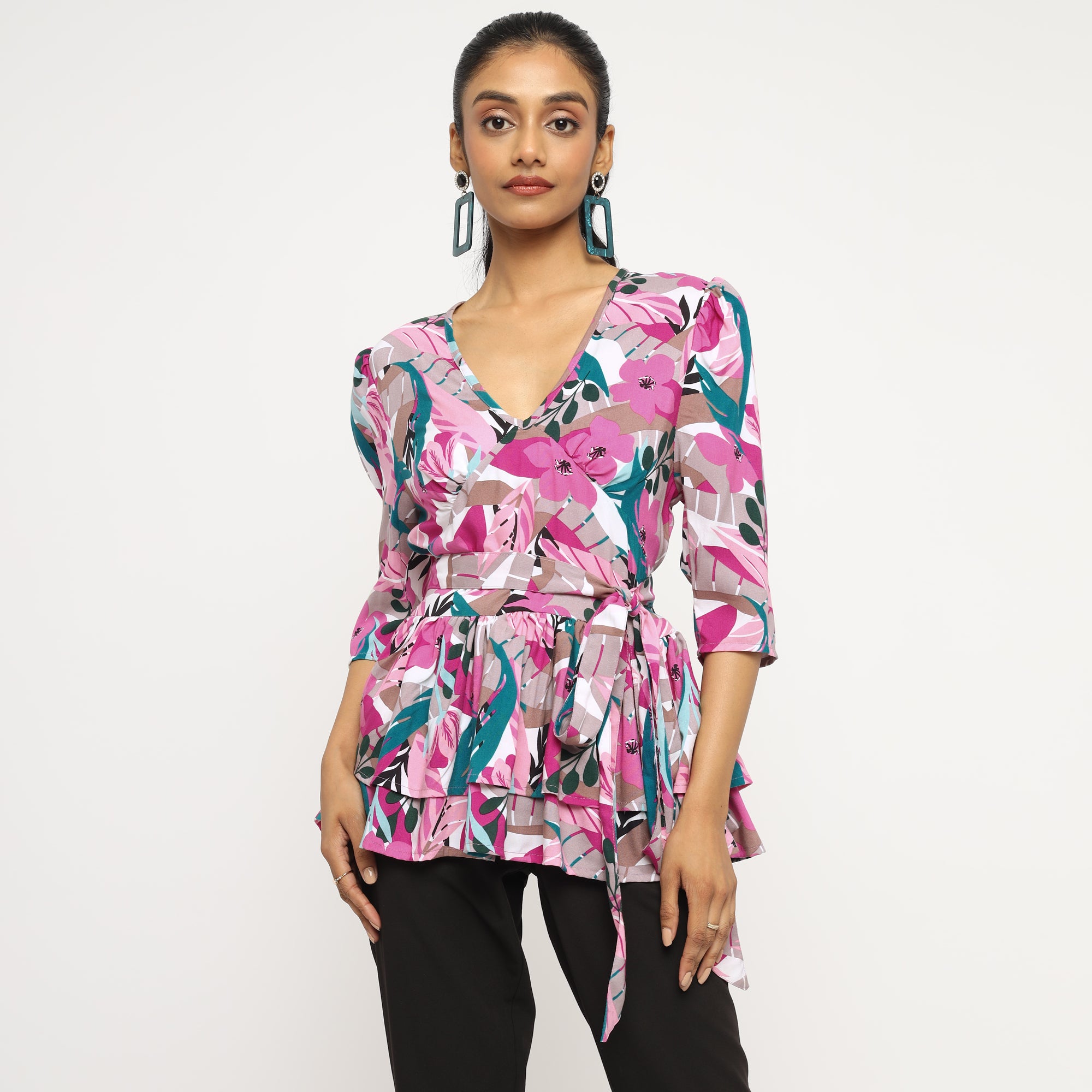 Pink Multicolor Floral Peplum Wrap Top