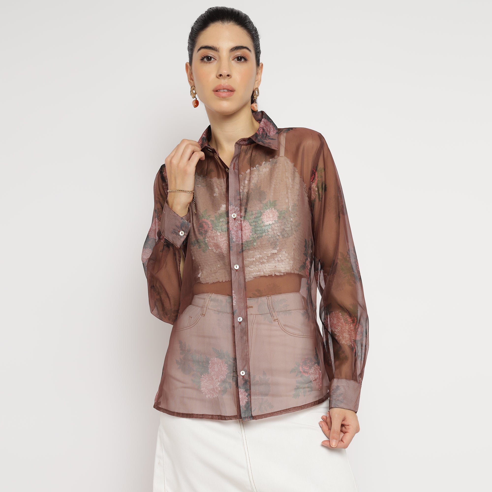 White Sequin Crop Top with Brown Floral Organza Overshirt Set